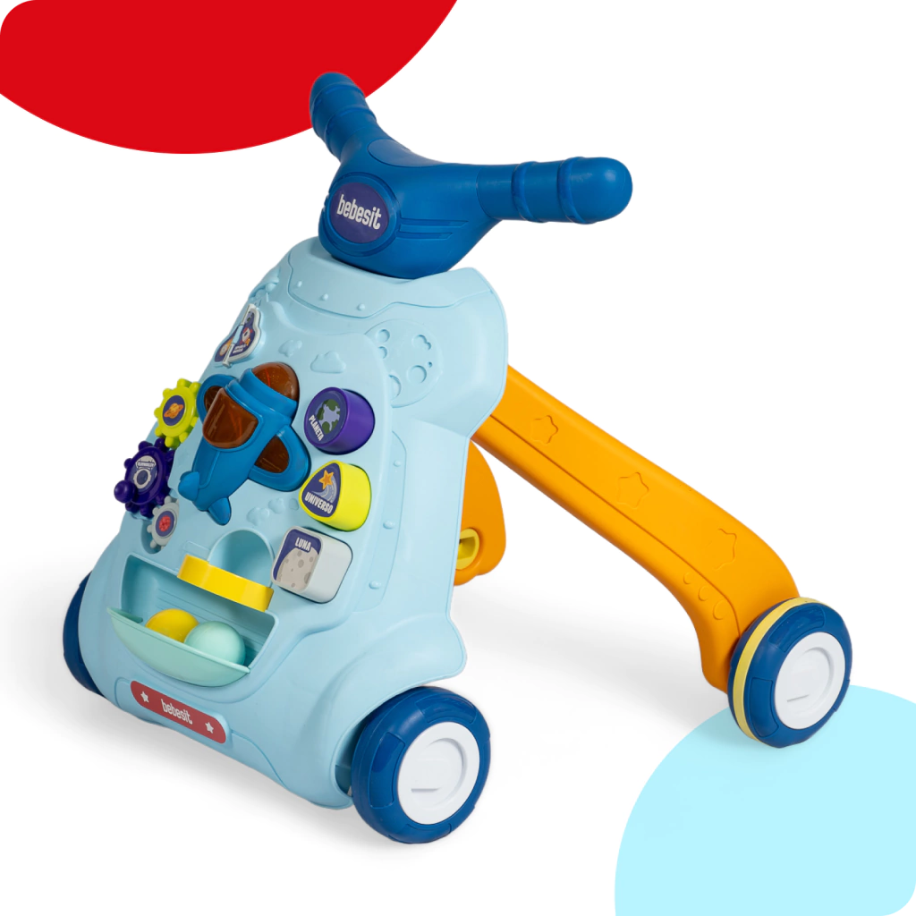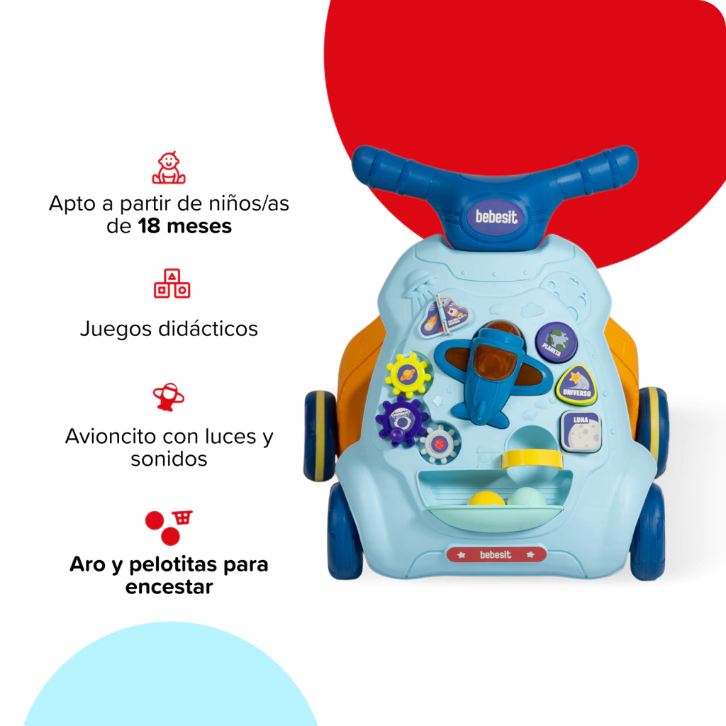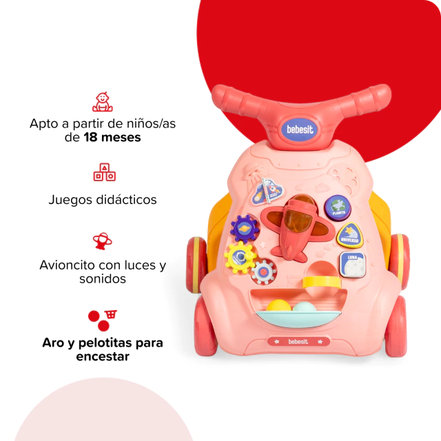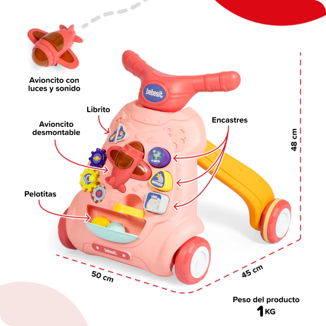 El Caminador Musical Bebesit 1801 está pensado para brindar seguridad, estabilidad y estimulación en la etapa de los primeros pasos. Su estructura firme y liviana ayuda al desplazamiento, mientras que el panel didáctico suma actividades que favorecen la motricidad y la coordinación: engranajes que giran, formas para encastrar, pelotas y aro de juego, además de un librito incorporado. También incluye un avión desmontable con luz y sonido (funciona con pilas AA, no incluidas).