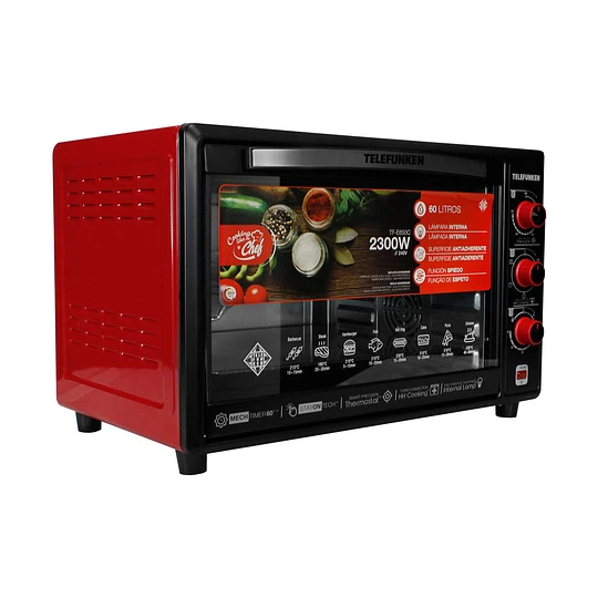 El TF E650C de TELEFUNKEN es un horno eléctrico con múltiples configuraciones de cocción, viene incorporada una lámpara interna para monitorear de mejor manera la cocción de los alimentos y una superficie interior antiadherente. El TF E650C posee un ventilador de convección que hace circular el aire caliente dentro del horno garantizando que el calor llegue a todos los rincones del interior de la cavidad.